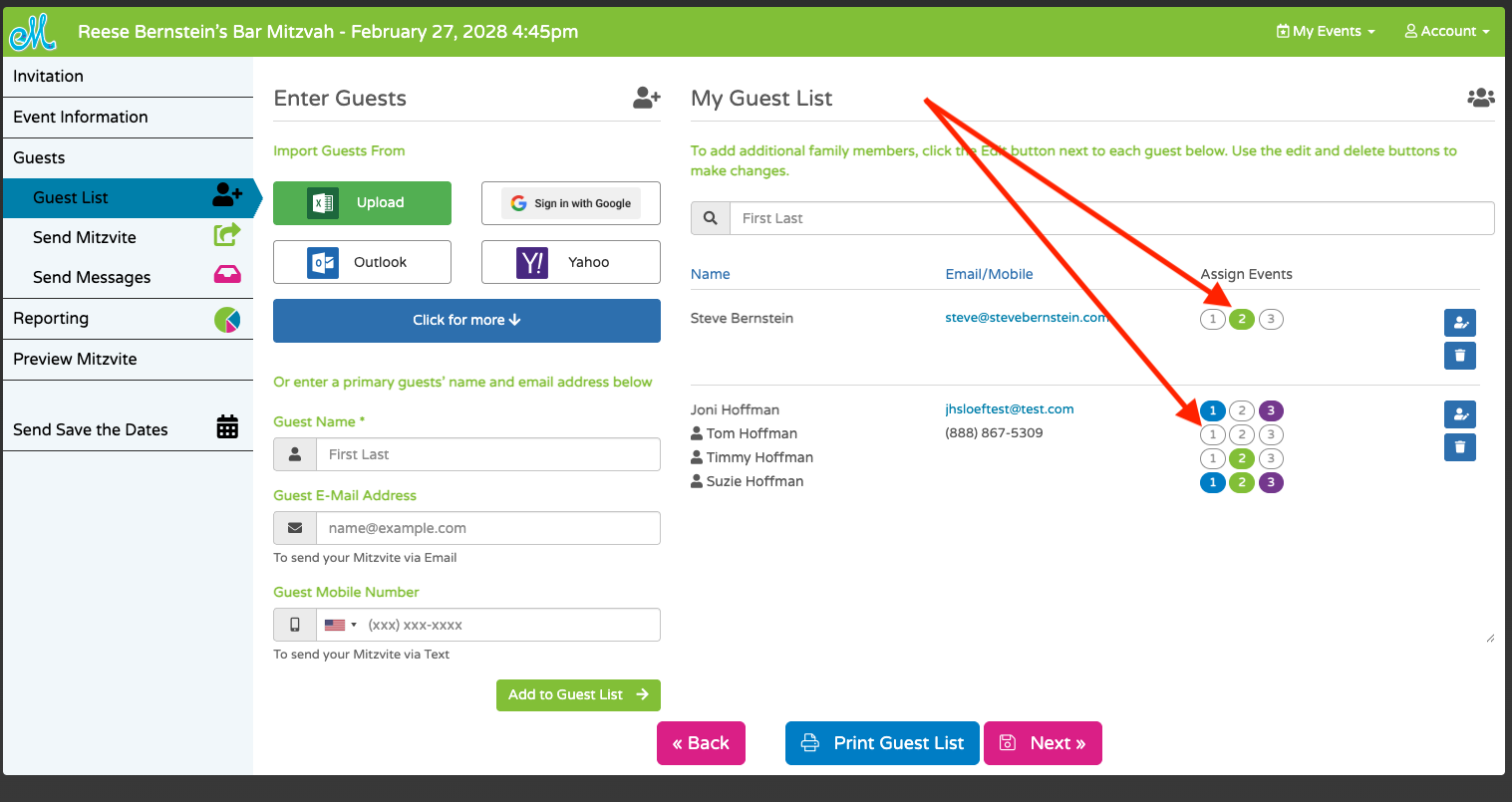 Now you are on your Guest List page. Easily assign guests to event(s) they are invited to by clicking the “Assign Events” button and clicking the appropriate checkboxes for each event. When this step is done and your invitations are sent, each guest only sees the event(s) they are invited to that you set up in this “Assign Events” section.